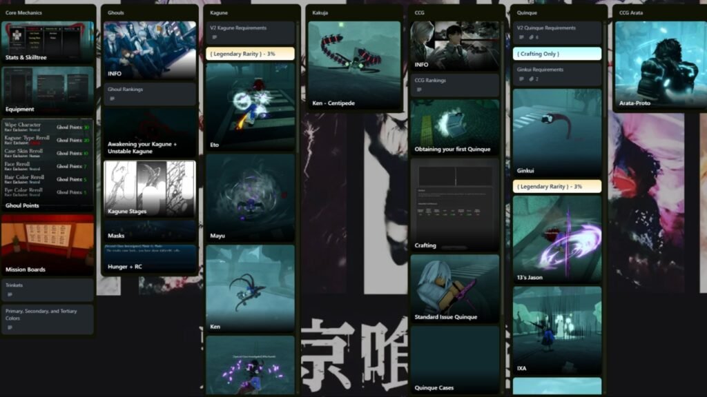 The Trello Board, on the other hand, is a great source of information for new players. The cards there provide tutorials on some of the major in-game mechanics along with items and equipment, the clans that are present currently, and the weapons that are available in both the Kagune and Quiques categories.